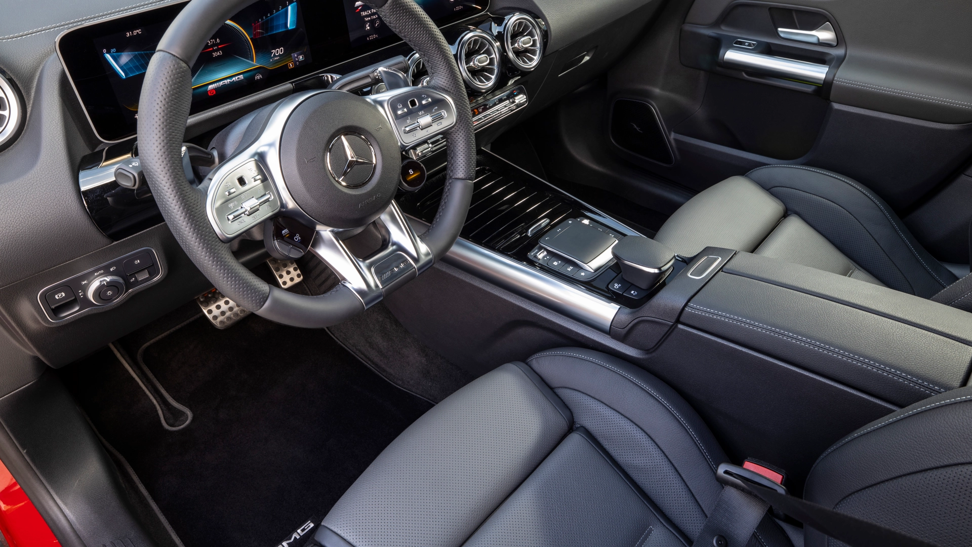 Sul posteriore spiccano la nuova grembialatura, lo spoiler sul tetto e i terminali di scarico. Le luci posteriori strette e sdoppiate sottolineano lo sviluppo in larghezza della coda di GLA. Internamente, invece, sono presenti sedili rivestiti in pelle ecologica ARTICO/microfibra DINAMICA nera con cucitura di contrasto rossa e cinture di sicurezza rosse. La strumentazione digitale è stata personalizzata con alcune visualizzazioni specifiche per i modelli AMG. Ovviamente presente il sistema MBUX con assistente vocale. Per l'occasione è disponibile, su richiesta, AMG TRACK PACE, una sorta di "ingegnere di pista" per analizzare nel dettaglio le capacità al volante e migliorarle.