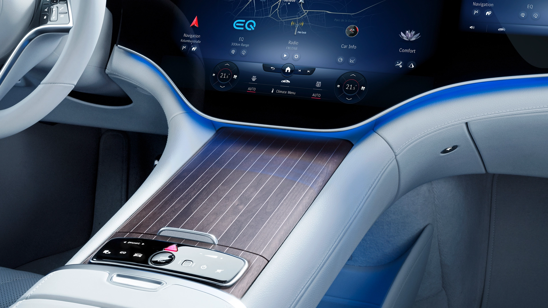Anche se le dimensioni sono simili a quelle della Classe S, la nuova piattaforma permette di rendere l'abitacolo molto più spazioso e comodo. Gli interni sono raffinati e lussuosi ma offrono pure tantissima tecnologia. Come abbiamo avuto modo di vedere, gli acquirenti potranno richiedere il sofisticato sistema MBUX Hyperscreen. Tale piattaforma può contare su di una superficie in vetro che si estende per quasi tutta la lunghezza della plancia (141 cm) che è stata realizzata utilizzando una tecnica di stampaggio svolta ad una temperatura di 650 gradi. Al di sotto, troviamo ben tre schermi: quello per la strumentazione da 12,3 pollici, quello per l'infotainment da 17,1 pollici (OLED) e quello da 12,3 pollici (OLED) per il passeggero.