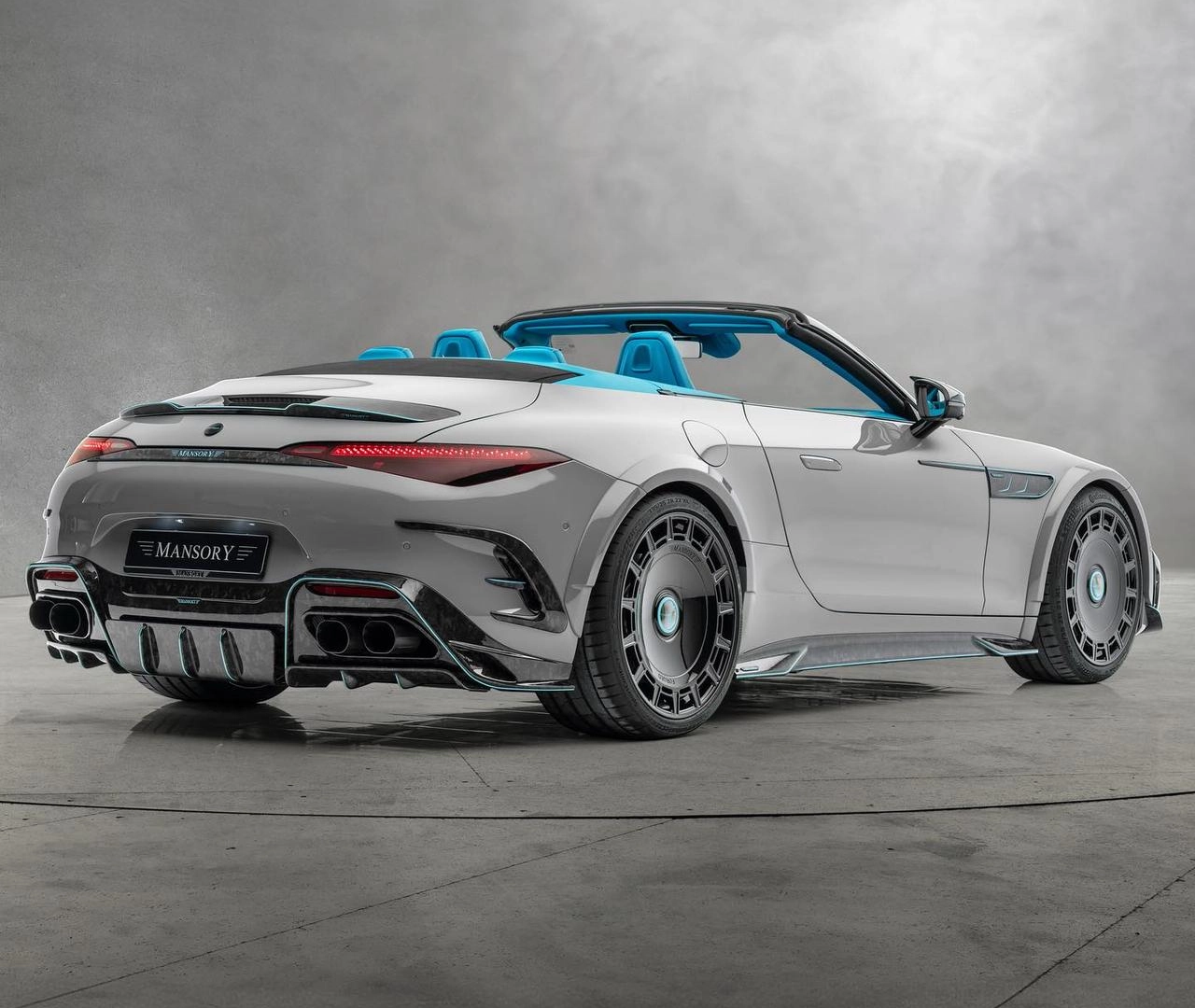 A livello estetico, la Mercedes-AMG SL 63 modificata si distingue per un frontale audace, caratterizzato da una nuova griglia, un badge Mansory prominente, vari elementi in fibra di carbonio e inserti blu.