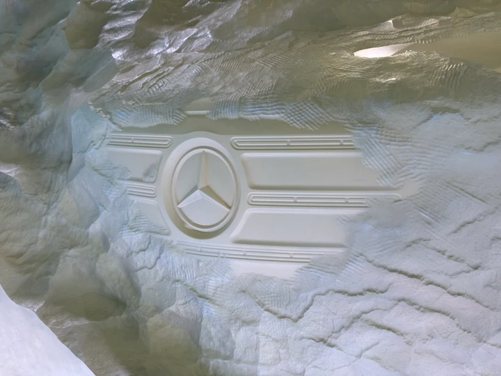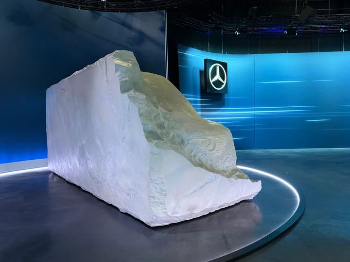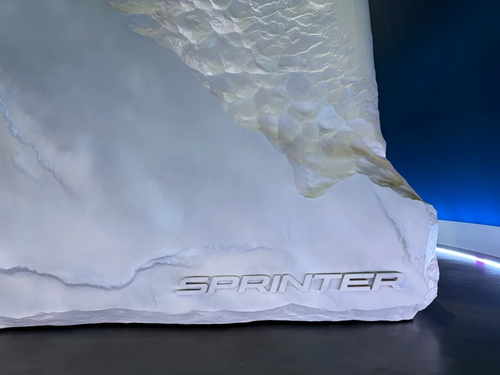 Ricavata da un unico blocco, la scultura mostra le linee della calandra anteriore e altri piccoli dettagli del futuro Sprinter, nonché le sue dimensioni. Lo abbiamo anche visto dal vivo, ma dato che uscirà sul mercato tra oltre un anno non abbiamo potuto fare alcuna foto del veicolo. Posso solo dire che non ha un aspetto futuristico, anzi: ho notato alcuni elementi anni ’80, e alcuni dettagli mi hanno riportato alla mente le vetture di Bruno Sacco, come la 190 e la E 200.