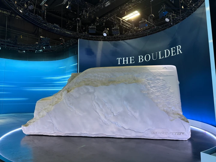 In vista dei 130 anni del suo primo veicolo dedicato al trasporto di merci, Mercedes-Benz Vans mette a confronto passato e futuro. E per anticipare il nuovo Sprinter, Mercedes-Benz ha presentato “The Boulder”, una scultura in stile pietra lunga 6,5 metri, alta 2,75 metri e larga 2,5 metri che anticipa (in parte) il futuro large van di Stoccarda.