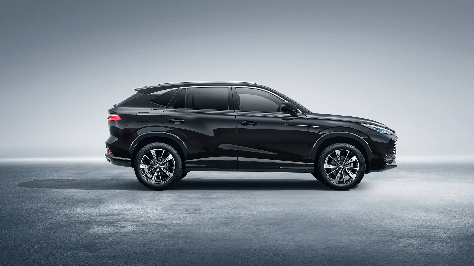 Il frontale è dominato dalla griglia unica centrale, impreziosita da elementi lucidi ad L rovesciata ed è racchiusa da due fender laterali sviluppati in verticale. Già a parte dalla versione base troviamo fari con tecnologia Full LED. I gruppi ottici sono collegati tra loro da un sottile linea cromata, creando un family feeling comune con MG ZS Hybrid+. I passaruota sono rimarcati da una finitura di colore nero. Il SUV dispone di cerchi in lega da 19 pollici.