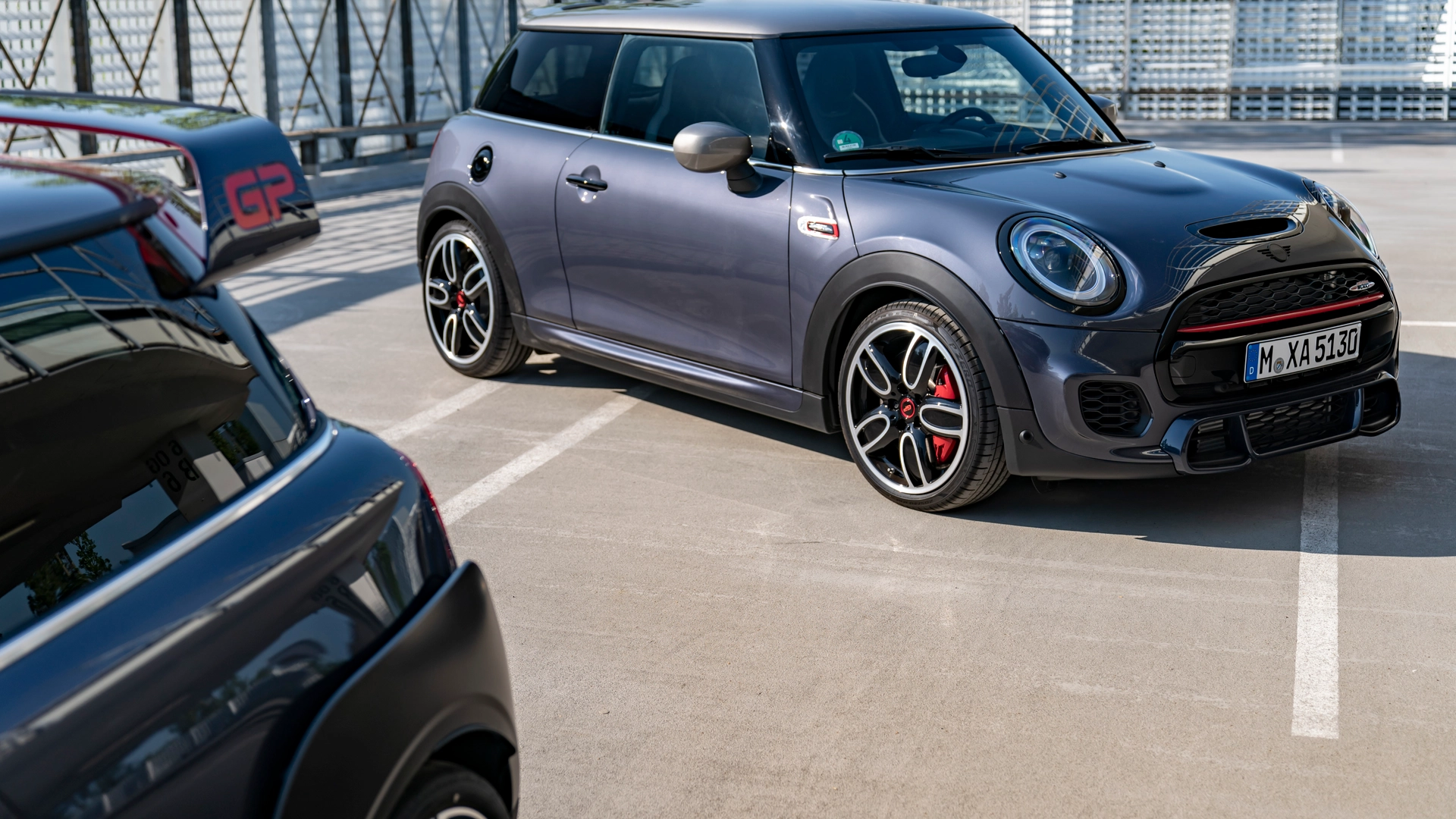 Esternamente spicca il contrasto tra i colori Melting Silver metallizzato per il tetto e Racing Grey metallizzato per la carrozzeria. I cerchi in lega leggera da 18 pollici sono impreziositi dal logo "GP". Il GP Pack include pure i fari anteriori e posteriori in Piano Black, il logo Mini nero sul cofano e sul portellone, i sedili sportivi con il logo "GP", il nuovo volante in pelle con cuciture rosse e i tappetini sempre con il logo "GP".