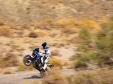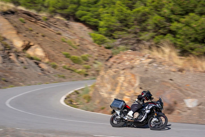 Il telaio perimetrale in acciaio con doppia culla è studiato per bilanciare stabilità e capacità di assorbimento, mentre il forcellone in alluminio alleggerisce la struttura e aumenta l’agilità. Le sospensioni Sachs, completamente regolabili, offrono 210 millimetri di escursione sia davanti sia dietro. La sella, regolabile in altezza tra 850 e 870 millimetri, si accompagna a una luce da terra di 230 millimetri. L’impianto frenante è firmato Brembo con pinze Stylema e dischi flottanti da 320 millimetri all’anteriore.