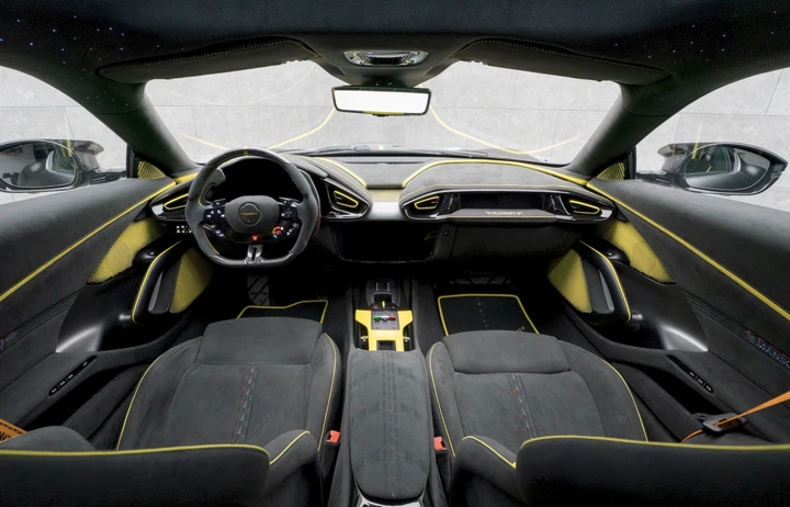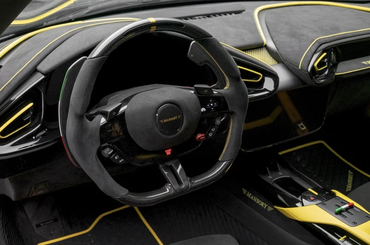 Il team Mansory non ha risparmiato l’abitacolo che ora vede un largo impiego di fibra di carbonio, Alcantara nera e inserti gialli a contrasto per enfatizzare l’anima sportiva.