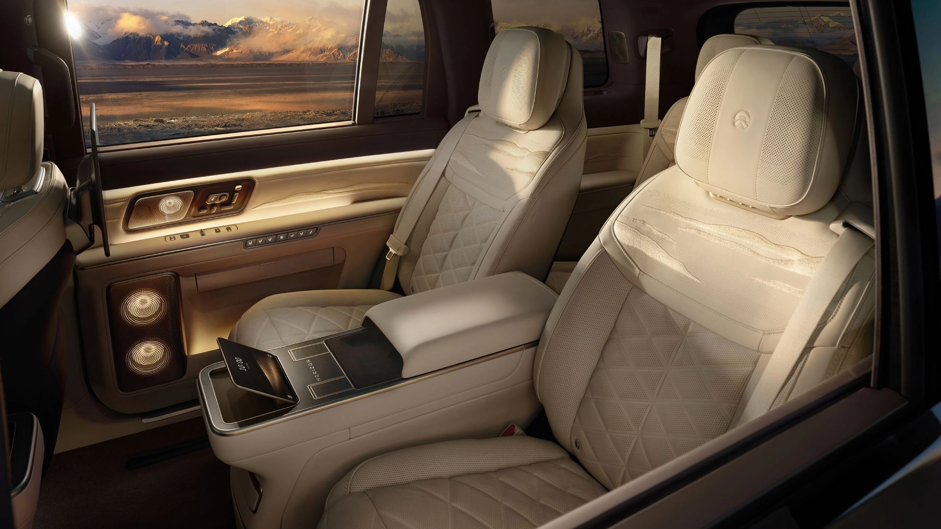 Il layout è a sei posti su tre file con configurazione 2+2+2. I sedili della seconda fila sono del tipo zero-gravity con ampia escursione di reclinazione, ventilazione, riscaldamento e funzione massaggio. La seconda e la terza fila dispongono di vetri elettrocromici con tre modalità: privacy, isolamento termico e trasparenza. La zona posteriore riprende l’architettura “Sky Island” ed “Executive Bridge” già vista sull’ET9, con due schermi panoramici Nio Link da 14,5” e uno schermo centrale posteriore da 8”. Gli allestimenti superiori includono inserti in legno naturale, pelle Nappa ed elementi ricamati su pannelli porta e poggiatesta.