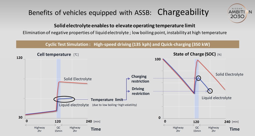 Il grafico mostrato da Nissan mostra i risultati di un test simulativo in cui i cicli prevedono la guida dell'auto ad alta velocità (2 ore a 135 km/h) seguita da una ricarica rapidissima a 350 kW per 15 minuti. Il sistema di test è privo di impianto di gestione termica delle batterie.