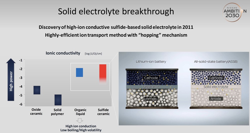 Lo svantaggio tecnico delle batterie allo stato solido è quindi la perdita in termini di conduttività ionica rispetto all'elettrolita liquido, problema a cui Nissan risponde con un metodo di trasporto degli ioni a maggior efficienza che garantisce pari conduttività ionica. Riducendo ai minimi termini, la chiave è quella di costruire vere e proprie "autostrade" per gli ioni, percorsi creati nella struttura cristallina del materiale al fine di facilitare il passaggio e ridurre le distanze.