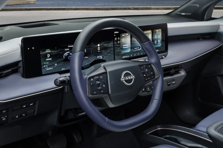 Grande passo avanti a livello degli interni rispetto alla passata generazione. La nuova plancia è infatti dominata da un pannello al cui interno troviamo i display da 14,3 pollici della strumentazione digitale e del sistema infotainment che dispone della suite Google integrata. Questo significa accedere ai servizi Google Maps, Assistant e Play Store. Non manca il supporto ai comandi vocali attraverso i quali il conducente potrà gestire alcune funzionalità della vettura tra cui il navigatore, il climatizzatore e i dispositivi multimediali. Nuovo è pure il volante multifunzione a due razze. Sotto al display dell’infotainment troviamo alcuni tasti a sfioramento per gestire alcune funzioni come quelle del climatizzatore e ancora più sotto sono stati collocati i pulsanti della trasmissione. Il sistema audio è firmato da Bose. Nuova Nissan Leaf supporta anche gli aggiornamenti OTA per rimanere sempre aggiornata nel corso del tempo.