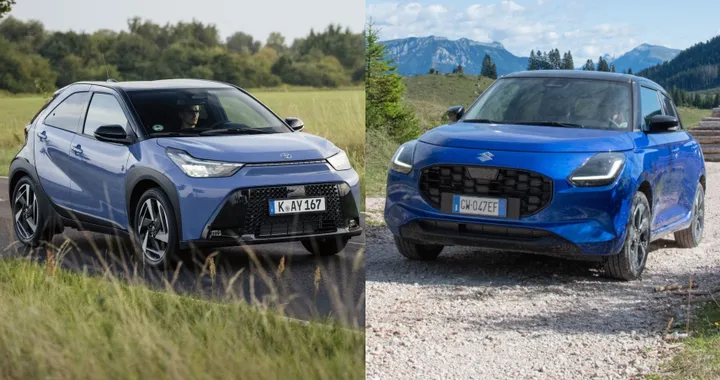 Due citycar ibride a confronto, da una parte la nuova Toyota Aygo X Hybrid appena arrivata sul mercato e dall'altra la Suzuki Swift