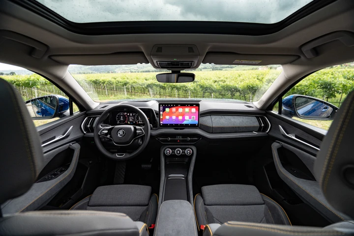 Sulla Skoda Kodiaq troviamo il Virtual Cockpit da 10 pollici, mentre centralmente è collocato il display da 10 o 13 pollici (a seconda della versione) del sistema infotainment. Al di sotto dello schermo centrale troviamo gli “Smart Dial". Si tratta di selettori circolari dotati di un display digitale da 32 millimetri. Questi consentono di accedere rapidamente a numerose funzioni del veicolo in base al livello di equipaggiamento. La terza fila di sedili, se presente, permette di ospitare bambini o persone comunque di bassa statura.