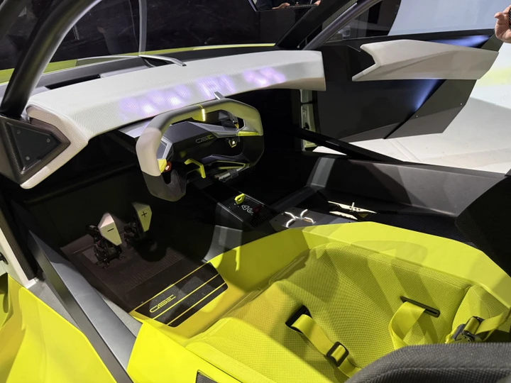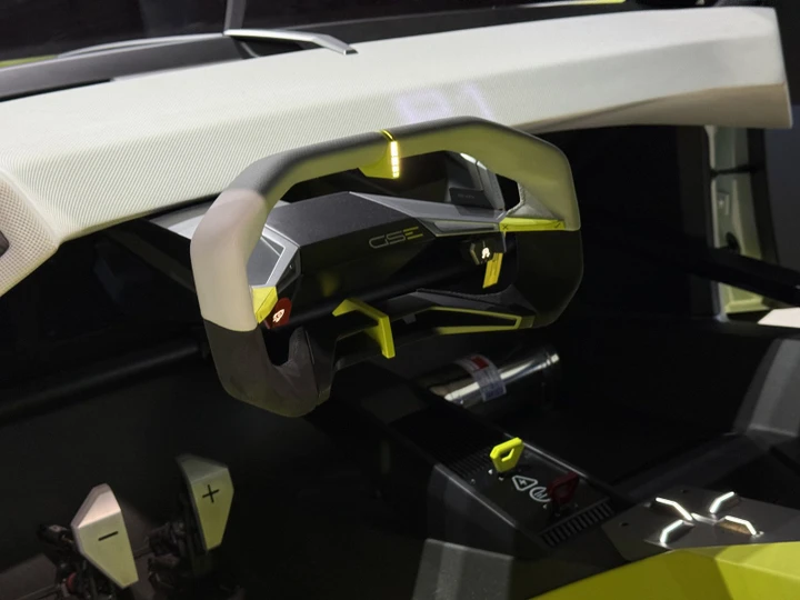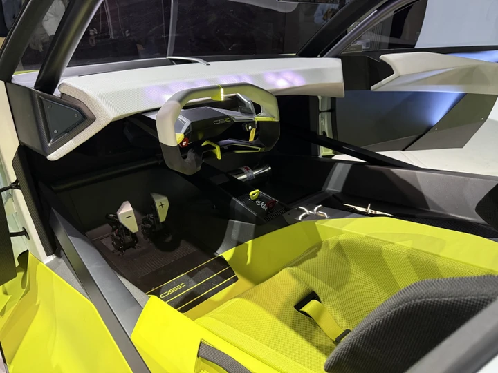 Nell’abitacolo l’approccio “detox”, come lo definisce la Casa, toglie il superfluo: il volante è molto largo e schiacciato, mentre il display proiettato in realtà aumentata fornisce le informazioni essenziali. Geniali i tessuti interattivi che segnalano l’angolo cieco illuminandosi e di grande effetto il sedile sospeso ultraleggero con seduta gialla (molto imbottita) e schienale nero con poggiatesta integrato. Non mancano le cinture a sei punti e il roll-bar di sicurezza. Si sta seduti molto in alto, ma il corpo è ben avvolto lateralmente per supportare le forti accelerazioni laterali.