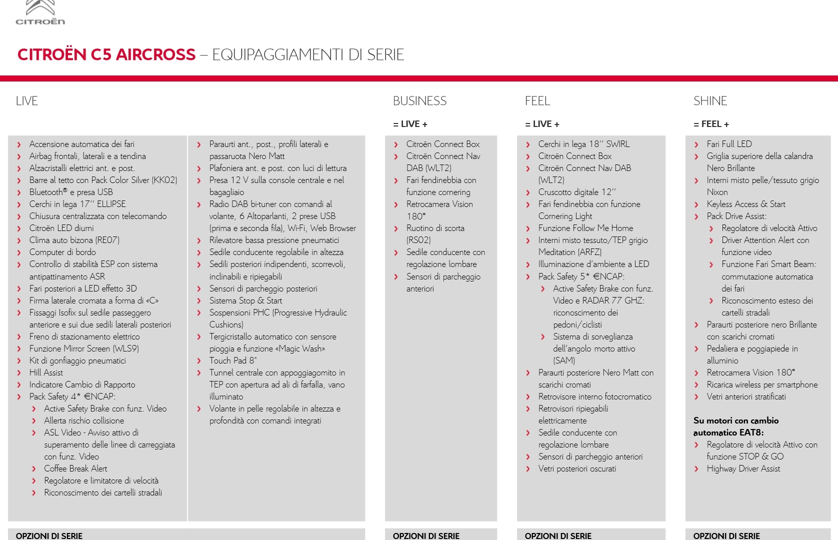 Veniamo ai prezzi: l'obbiettivo era portare un comfort superiore in una segmento C accessibile: C5 Aircross parte da 25.700€ e arriverà tra fine 2018 e gennaio 2019. Highlights di serie: sensori luci e tergi, diurne a LED, touch da 8 pollici, Bluetooth, USB e DAB, cerchi da 17" in lega (optional 18" e 19"), sospensioni progressive, sensori posteriori, volante in pelle, frenata d'emergenza, anticollisione, monitoraggio corsia, limitatore, cruise e riconoscimento segnali.