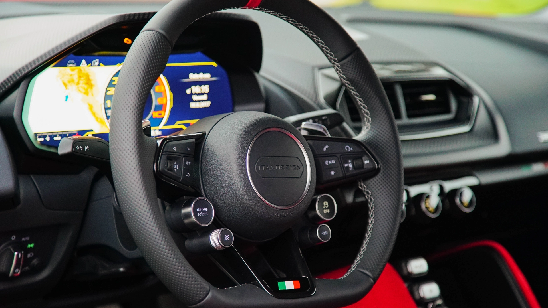 Appena schiaccio il pulsante Start posto sul tunnel centrale si presenta subito bene con un sound cattivo, anche un po’ maleducato, ma va benissimo così: è il suono ancora più sfacciato del V10 5.2 aspirato che montano anche Audi R8 e Lamborghini Huracan, con ben 610 CV. Posizionato centralmente, è abbinato ad un cambio a doppia frizione a sette rapporti e alla trazione integrale della Casa di Ingolstadt.