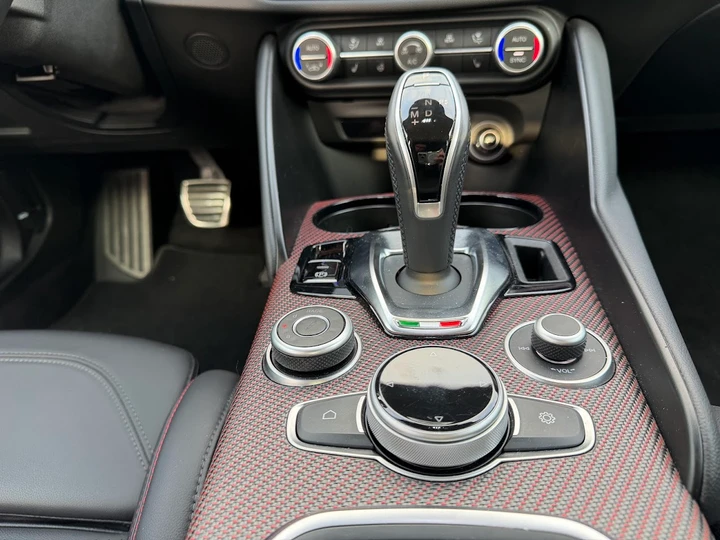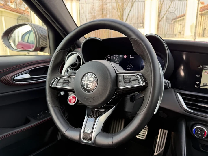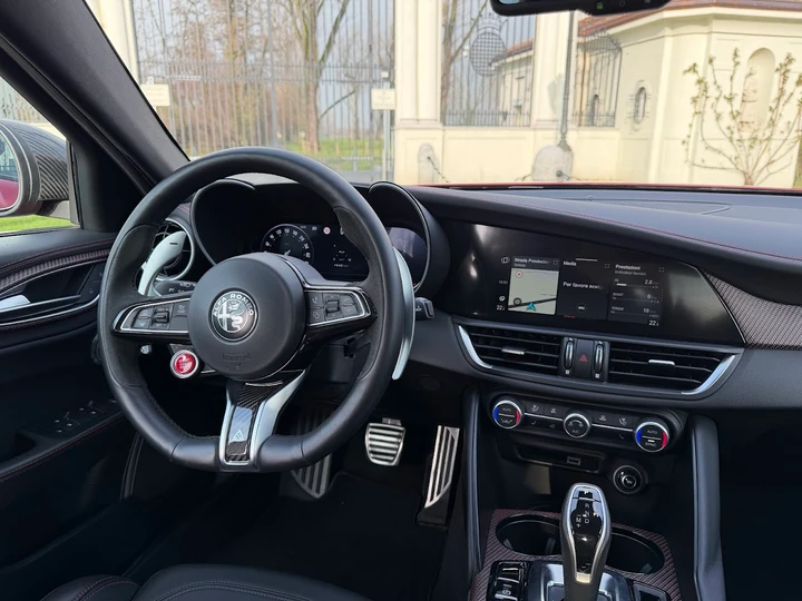 Per il resto rimane la Giulia che già conosciamo, con qualche piccola chicca che ricorda che stiamo guidando la versione più potente: il tunnel centrale è completamente ricoperto da fibra di carbonio rossa specifica per l’edizione limitata e i sedili sono molto contenitivi e funzionali e presentano l’impuntura “Super Sport" in rosso. Il volante davanti al conducente si caratterizza per essere estremamente funzionale nell’impugnatura e molto ergonomico, anche grazie alla presenza di tasti fisici per la gestione di ADAS e media che ne enfatizzano la praticità di utilizzo. Molto bello il tasto di accensione, rosso, che invoglia ad accendere il V6.
