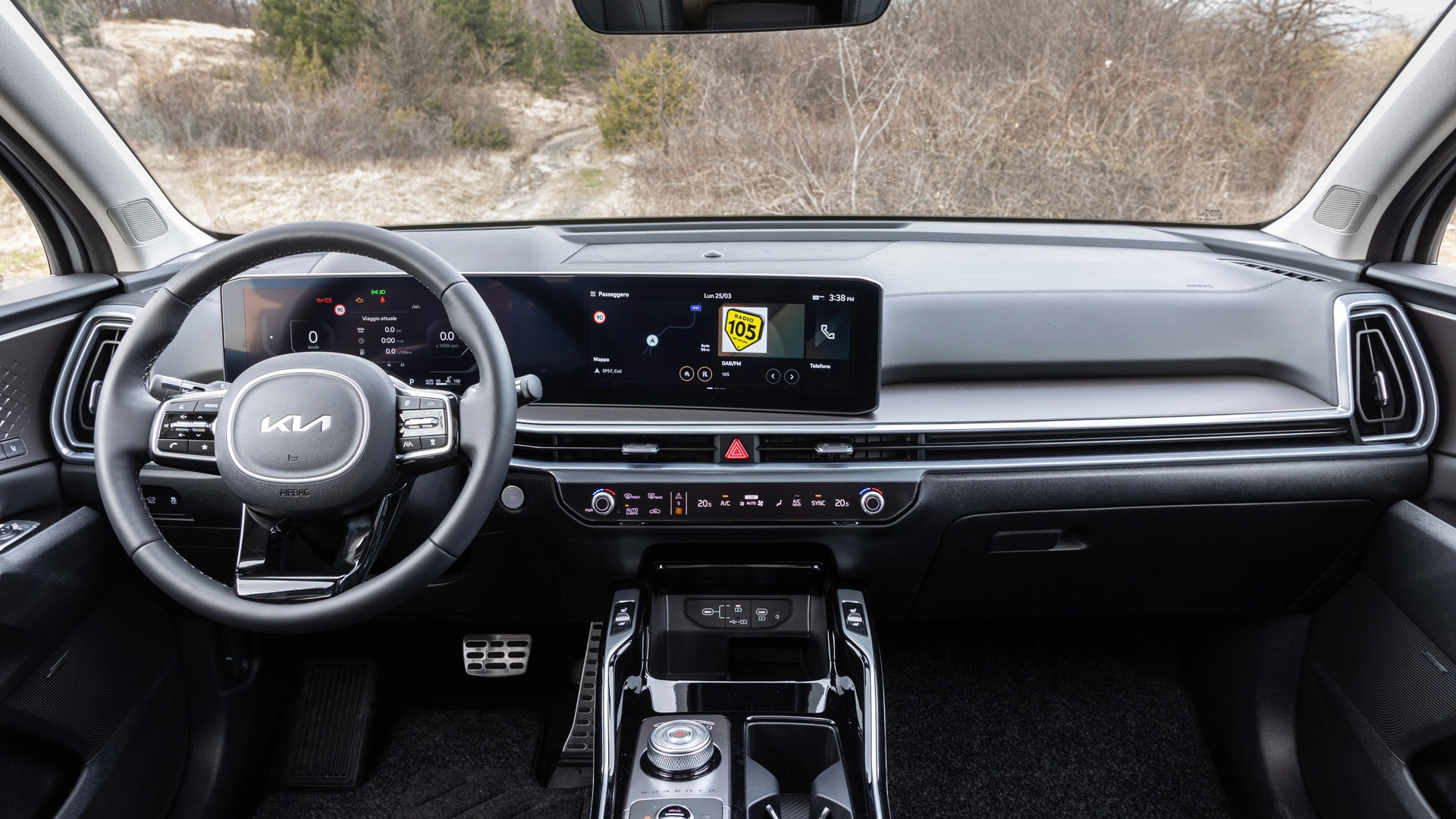 Per quanto riguarda la dotazione di serie, la Business ha già diversi ADAS, incluso il centramento dell'auto in corsia e il cruise control adattivo, il clima a due zone, i sedili posteriori scorrevoli individualmente, sensori luci e pioggia, sensori di parcheggio anteriori, keyless, Full LED, retrovisori elettrici, 7 posti, infotainment da 12,3" con CarPlay e Android Auto (ma la strumentazione ha solo uno schermo da 4,2" e non quello da 12,3"), 3 anni di aggiornamenti mappe OTA, 7 anni di traffico Kia Connect, varie USB e il retrovisore elettrocromatico.
