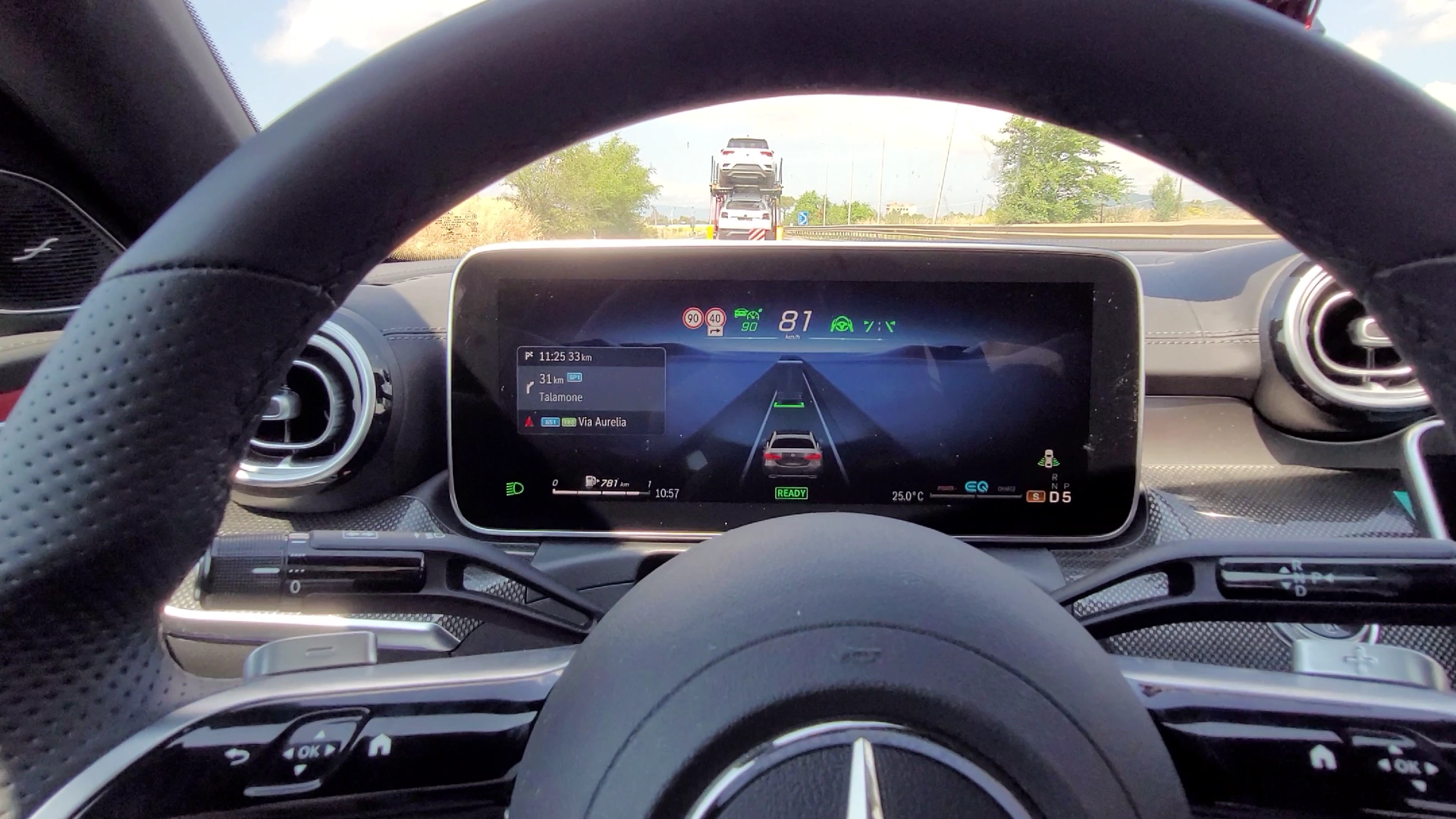 Complice una bomba d'acqua improvvisa e una corsa verso Roma per non perdere il treno, Classe C ha affrontato questo primo test drive superando brillantemente condizioni difficili: lo scenario vedeva diverse auto ferme a bordo strada, in attesa di una tregua dal muro di pioggia per poter tornare ad avere un minimo di visibilità. In queste condizioni, la nuova Classe C ha dato prova di forza e di sicurezza: attivata la modalità Sport, per avere più margine di controllo umano nei tornanti allagati, la 220 d ha sfruttato perfettamente il supporto elettrico al motore diesel in salita.