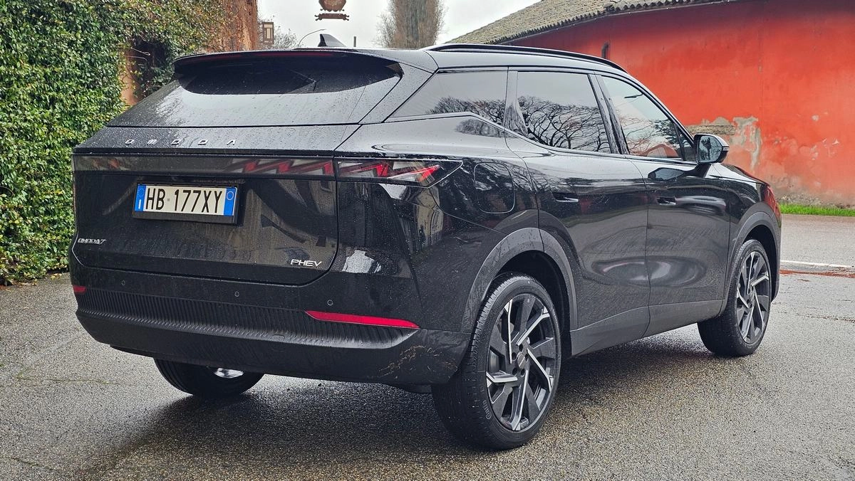 L’abitacolo è visivamente spostato un po’ più dietro e la forma di questa 7 è filante ma allo stesso tempo imponente. Merito sicuramente si dettagli come i cerchi da 20 pollici, che non hanno proporzioni da sfigurare all’interno del passaruota. Le chicche di design però non finiscono qui, avendo le maniglie a filo della porta e concentrando sulla “spalla" posteriore quello che vuole essere una firma riconoscibile. In Omoda lo chiamano un “muscolo", ed in effetti è un tratto di carrozzeria che allarga notevolmente le spalle di questo SUV. Serve anche a contribuire alla visione di un posteriore molto piantato a terra. Certo il lunotto è posizionato molto in alto sotto allo spoiler, motivo per il quale le telecamere sono necessarie.