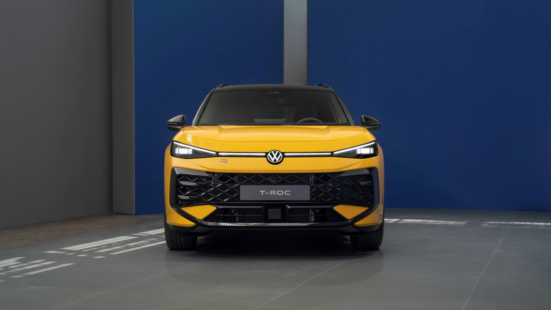La nuova T-Roc prosegue un design sicuramente iconico portato dalla precedente e si modernizza molto portando in dote elementi come un frontale molto più squadrato ed audace, che integra una striscia LED che corre da lato a lato e collega i nuovi fari a LED, oltre ad avere nel suo centro il logo VW retroilluminato, come di consueto sulle ultime novità del marchio tedesco. Sotto ai fari trova posto una nuova ampia griglia, delimitata lateralmente da elementi aerodinamici. Inoltre uno spoiler in stile protezione sottoscocca chiude l’area verso il basso.