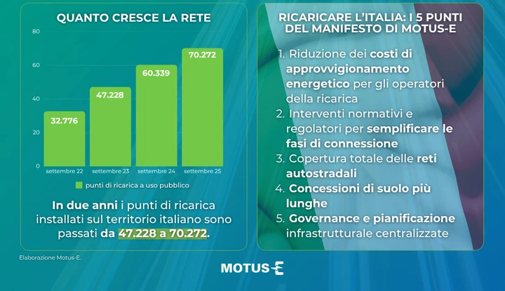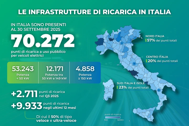 Quante e dove sono le colonnine per la ricarica delle auto elettriche in Italia? Sono poche come qualcuno crede o siamo già a buon punto? Il nuovo rapporto di Motus-E fa scatta una fotografia dell’infrastruttura di ricarica al 30 settembre 2025. Nel nostro Paese risultano quindi 70.272 punti di ricarica a uso pubblico installati. Si tratta di una crescita di 2.711 unità nel terzo trimestre dell’anno. Negli ultimi 12 mesi sono invece stati installati 9.933 nuovi punti di ricarica.