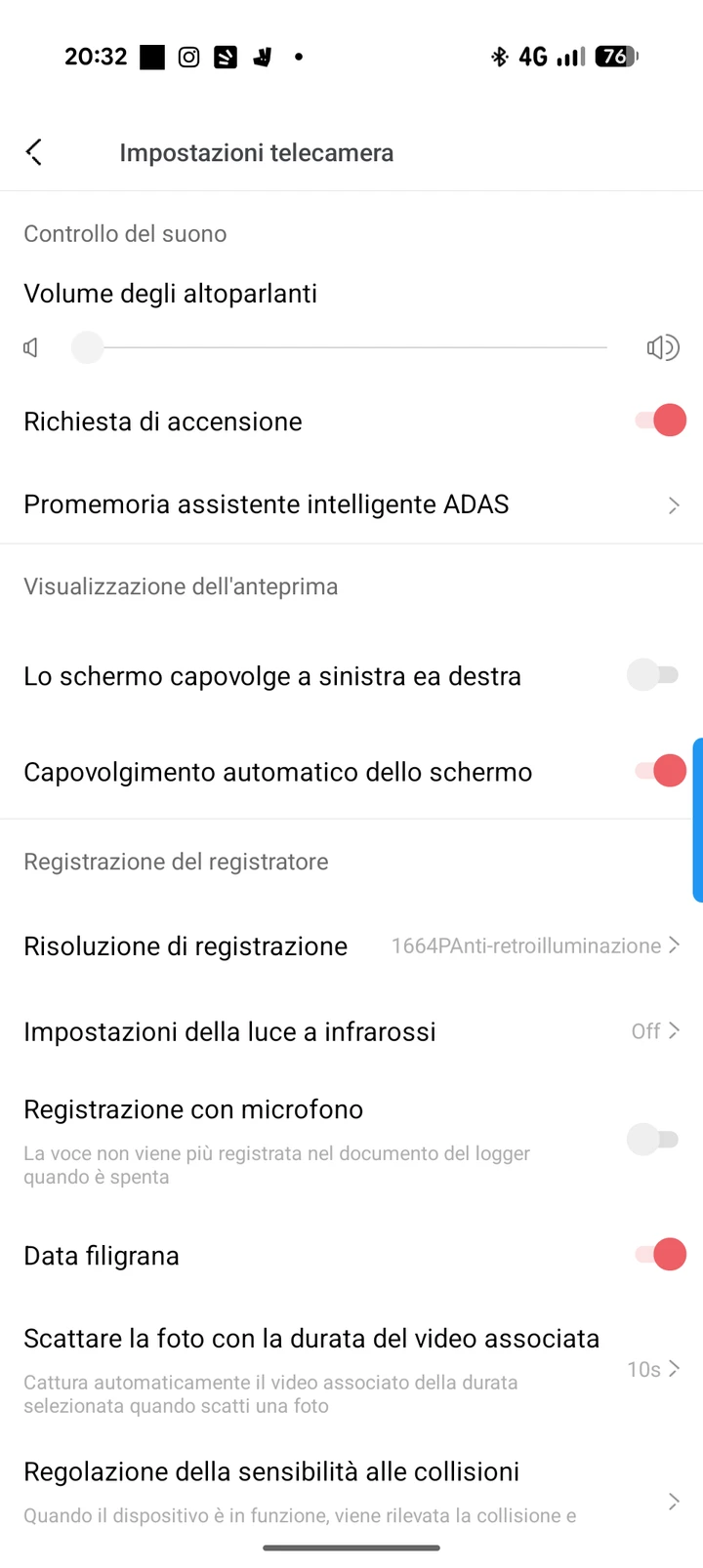 Le camere interna e posteriore lavorano a risoluzioni inferiori rispetto alla frontale, ma restano comunque più che adeguate per il loro scopo. Quella interna è particolarmente utile per chi usa l’auto anche per lavoro o per servizi di ride sharing, mentre la posteriore aggiunge un livello di sicurezza importante.