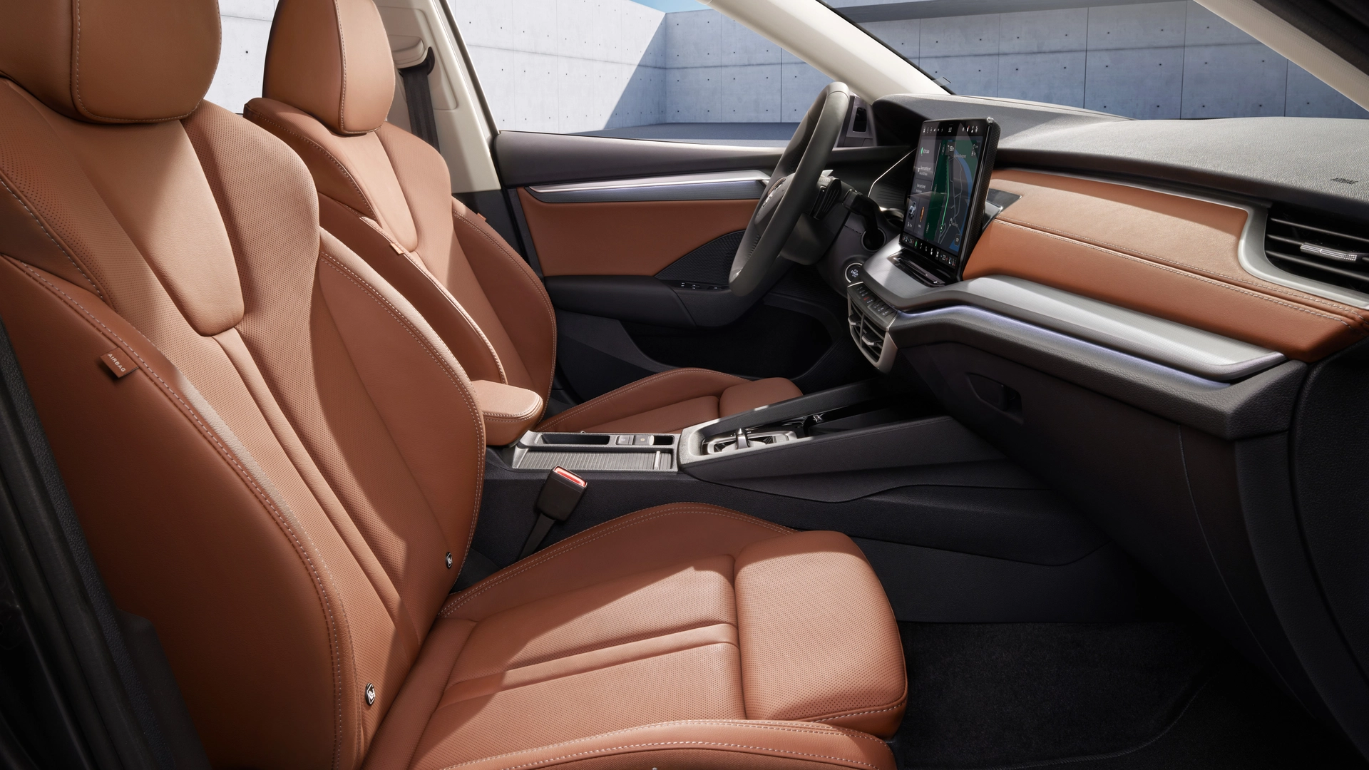 Per quanto riguarda gli interni, Skoda ha voluto non solo migliorare la qualità percepita ma pure aumentare la quantità di materiali sostenibili utilizzati. Di base, troviamo uno schermo da 10 pollici per la strumentazione digitale ed un display sempre da 10 pollici per il sistema infotainment. Come optional è possibile avere uno schermo da 13 pollici per il sistema infotainment, lo stesso introdotto su altri modelli del Gruppo Volkswagen come nel restyling della Golf.