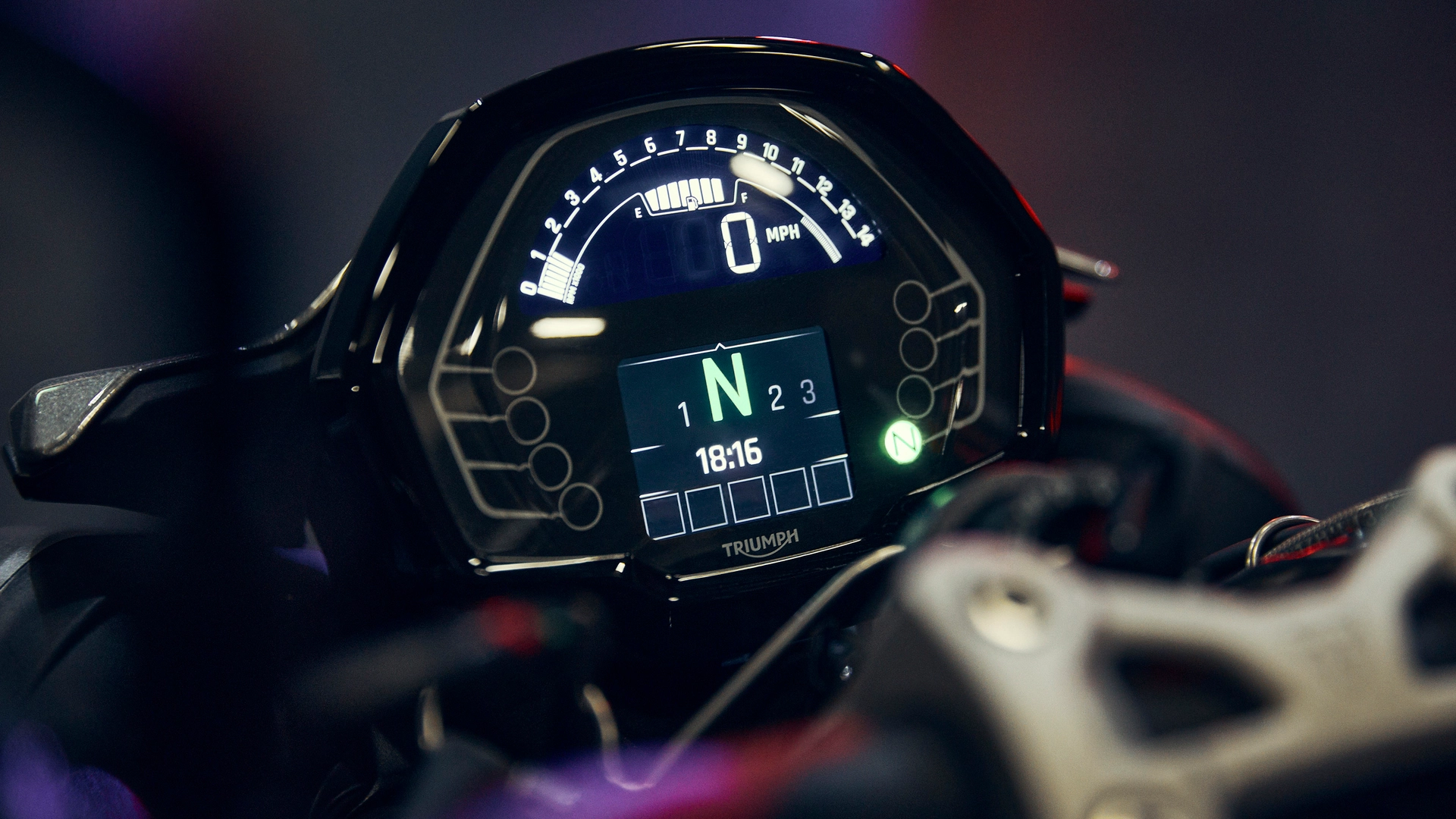 La Street Triple R è dotata di una strumentazione multifunzione immediata, completa e di facile lettura, che include un display TFT per le informazioni chiave durante la marcia. Le nuove Street Triple 756 RS e Moto2 Edition vengono equipaggiate con un dashboard TFT con schermo a colori da 5 pollici.