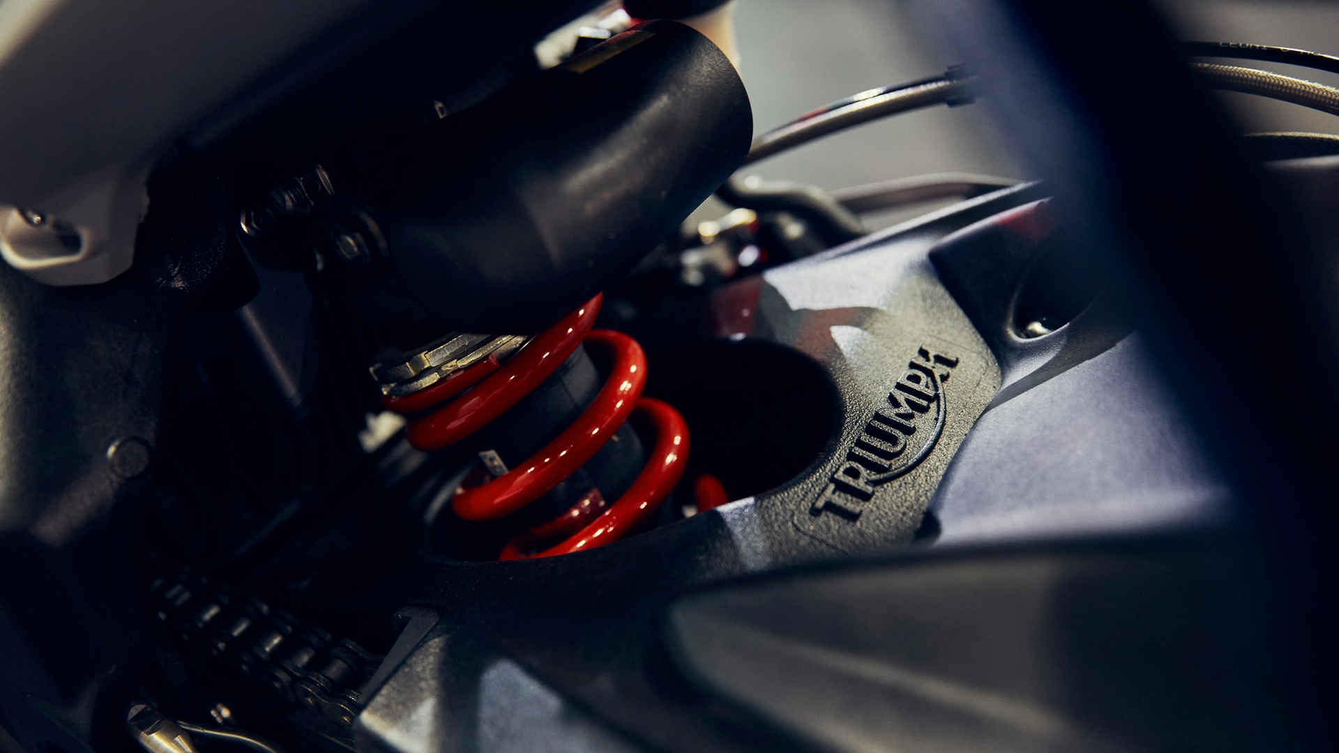 La Street Triple R monta di serie forcelle Showa 41mm con funzioni separate, e un monoammortizzatore Showa del tipo monoshock. L’ancora più prestigiosa versione RS prevede forcelle Showa 41mm mentre al posteriore un ammortizzatore Öhlins. La Street Triple 765 Moto2 Edition sale ulteriormente di livello, tramite una forcella da ben 43mm firmata Öhlins per una guida ancora più precisa tra i cordoli, coadiuvata ad un mono al posteriore dello stesso produttore. L’escursione anteriore è, per tutti i modelli, di 115mm, mentre al posteriore si prevedono 131.2mm per RS e Moto2 Edition, e 133.5mm nel caso di Street Triple R.