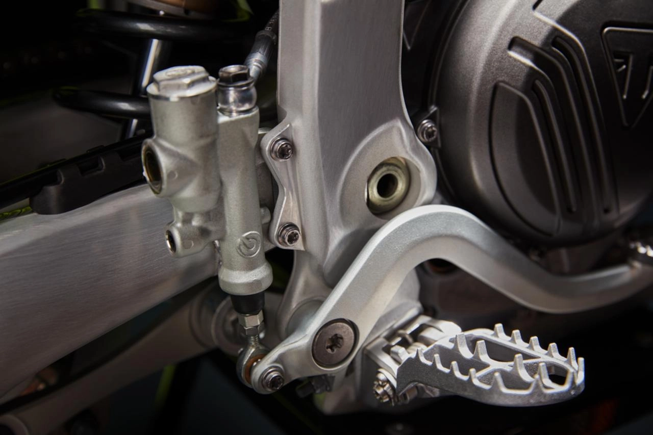 Il progetto della nuova TF 250-X, frutto di una collaborazione con leggende dell'off-road come Ricky Carmichael e Ivan Cervantes, è partito da zero. Il suo motore a quattro tempi e il telaio in alluminio sono stati progettati per massimizzare compattezza e leggerezza, integrando componenti di alto livello disponibili sul mercato. Il design della moto, essenziale ma audace, presenta un'accattivante combinazione di nero e Triumph Racing Yellow.
