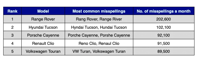 Volgendo lo sguardo ai modelli, la testa della classifica viene occupata da Range Rover, che mediamente paga oltre 200 mila digitazioni errate al mese: Rang Rover e Range River gli errori più comuni. Ai piani alti di quest'altra classifica rimane Hyundai, seconda con Tucson non perché si sbagli il nome del modello ma ancora una volta il nome del brand, e lo stesso destino riguarda Porsche che con Cayenne sigilla anche questo podio.